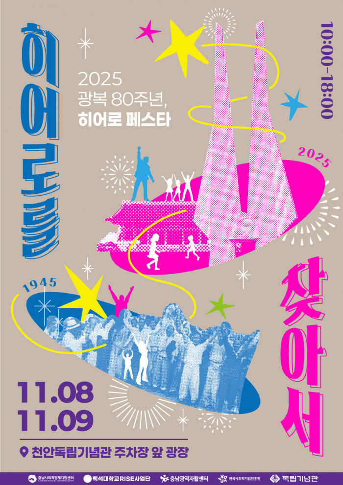 충남사회적경제지원센터는 백석대학교, 충남광역자활센터, 한국사회적기업진흥원, 독립기념관과 함께 지역 상생축제 「히어로 페스타」를 개최합니다.