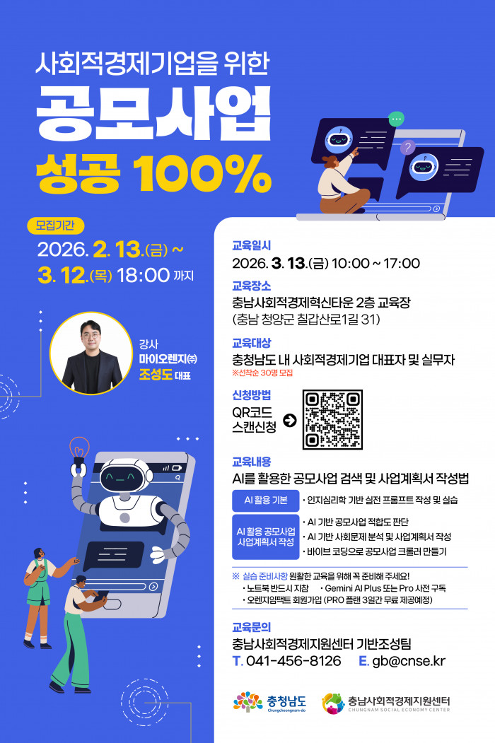 이번 교육은 단순한 이론이 아닙니다. 내 사업에 딱 맞는 공모사업을 AI로 찾아내고, 실질적인 서류 작성법을 익히는 교육입니다. 2026년 공모사업 시장의 승리자, 바로 당신이 될 수 있습니다.
